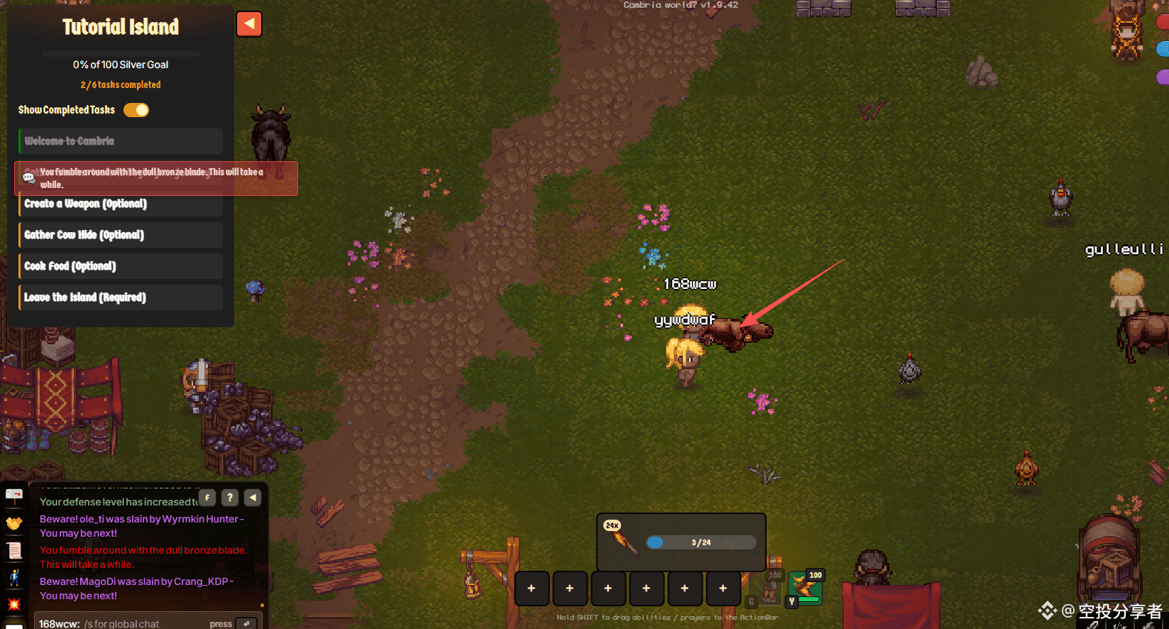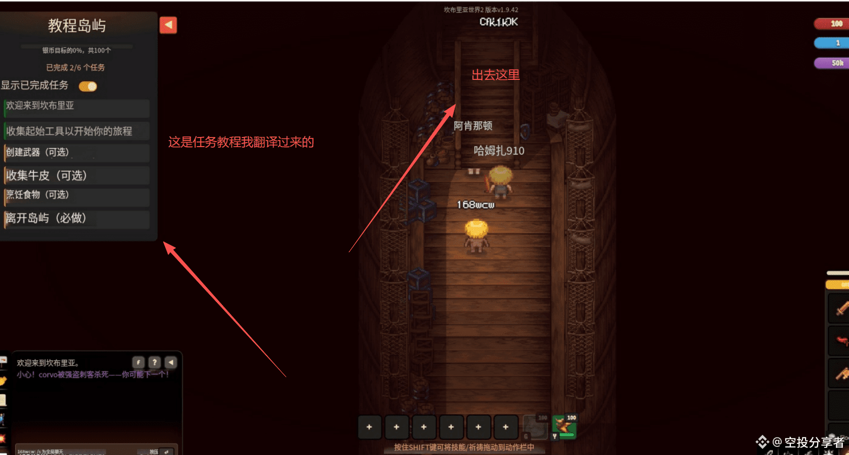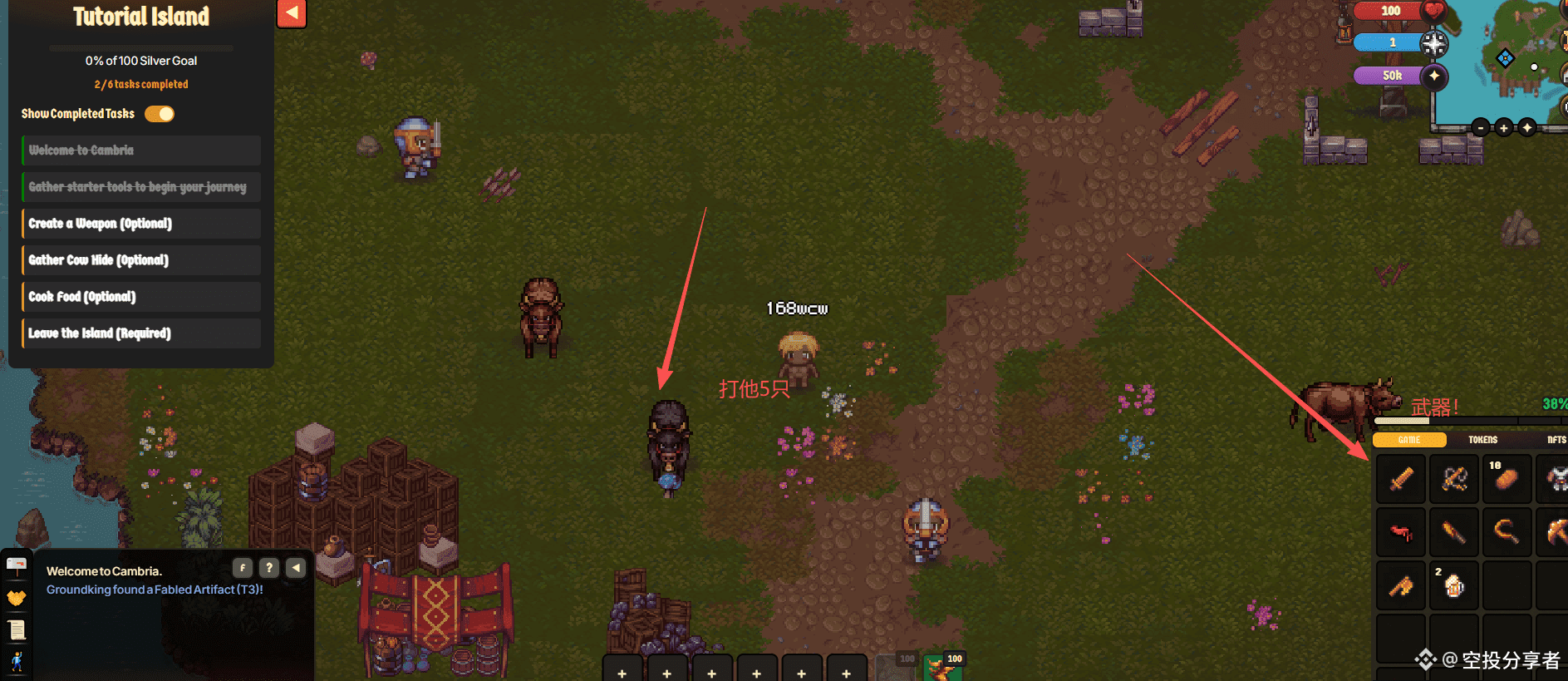 出来后砍5只牛,箭头那里有武器鼠标右键带上,打牛可以升级,衣服也可以穿上!