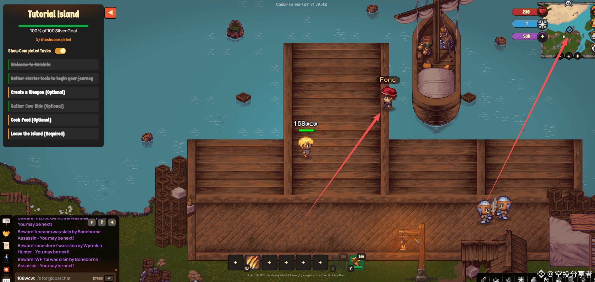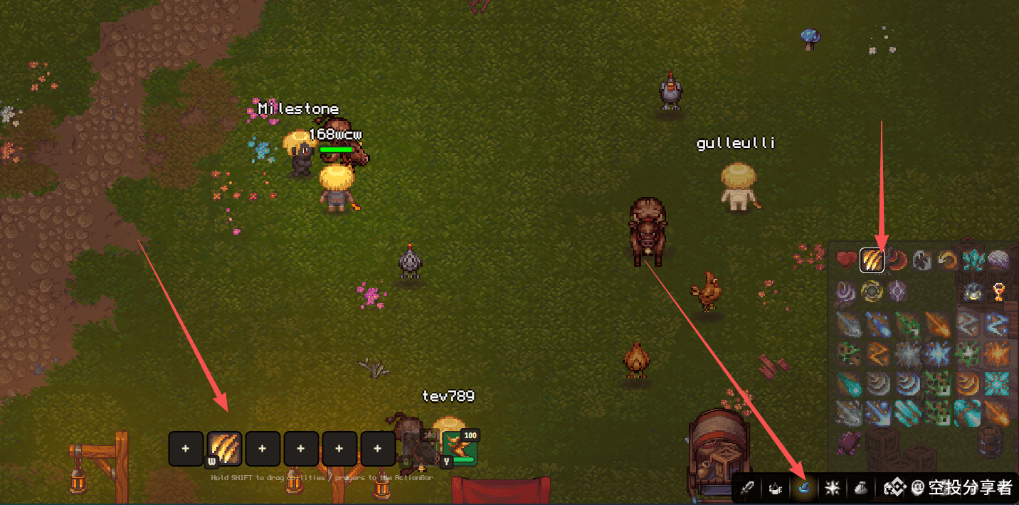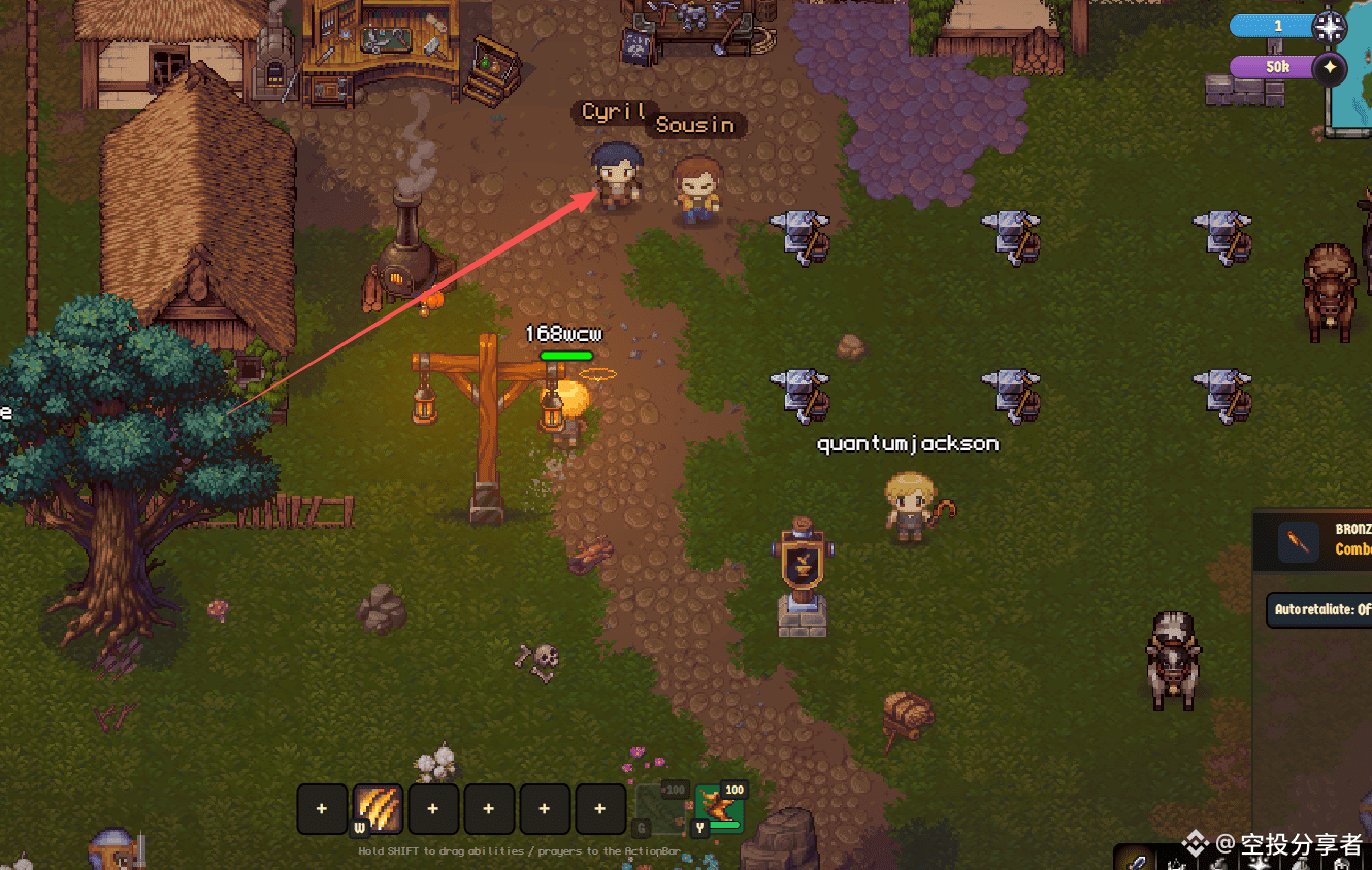 出来后砍5只牛,箭头那里有武器鼠标右键带上,打牛可以升级,衣服也可以穿上!