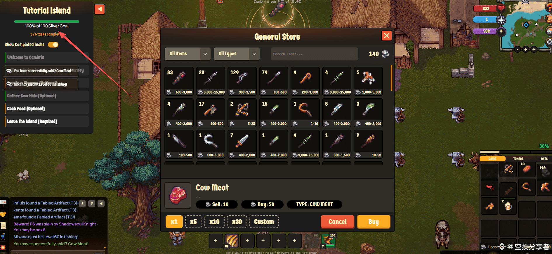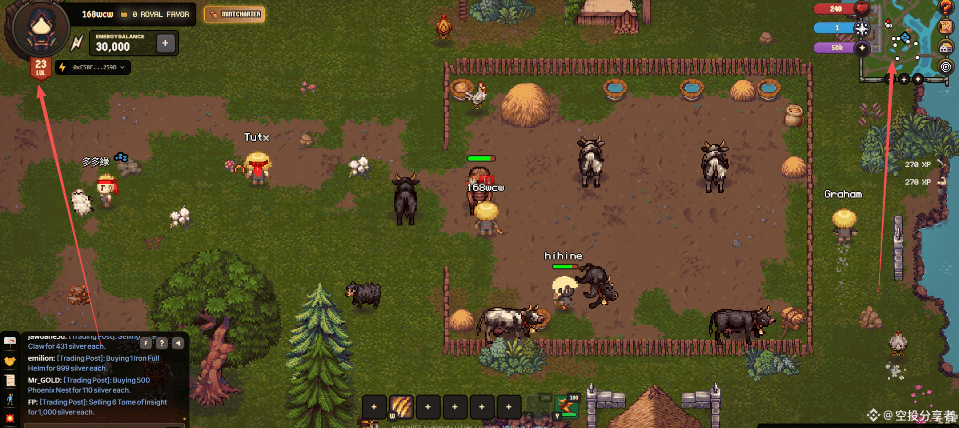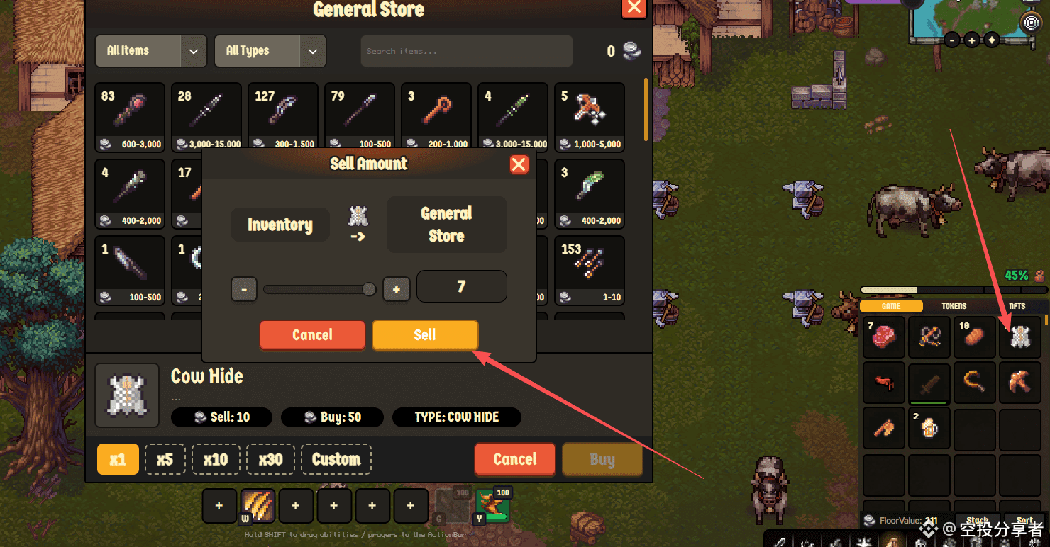 然后进城,去右下角找到牧场打牛升到40级,很快完成,可以不用收集牛肉到了看着技能的等级开砍到40就结束离 如果后面继续深度玩可以刷怪获取装备与银币交面具后可快速拿到天量银而钓鱼挖矿等也可以卖出获得银而!