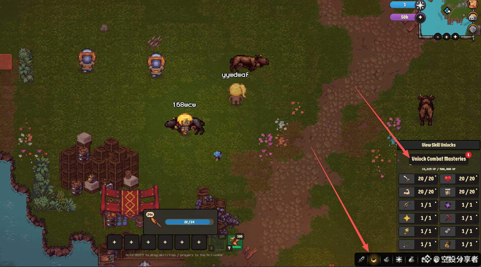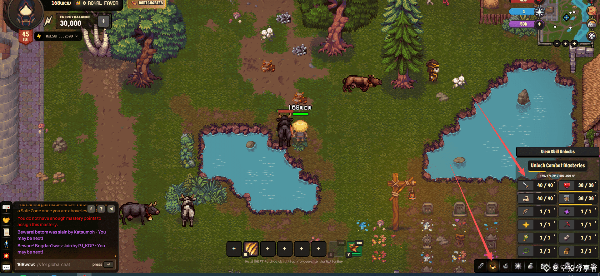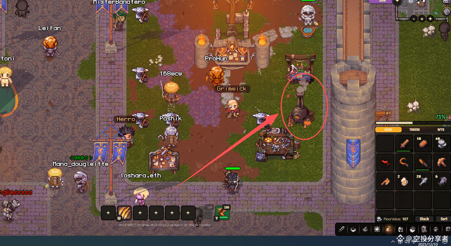 然后进城,去右下角找到牧场打牛升到40级,很快完成,可以不用收集牛肉到了看着技能的等级开砍到40就结束离 如果后面继续深度玩可以刷怪获取装备与银币交面具后可快速拿到天量银而钓鱼挖矿等也可以卖出获得银而!