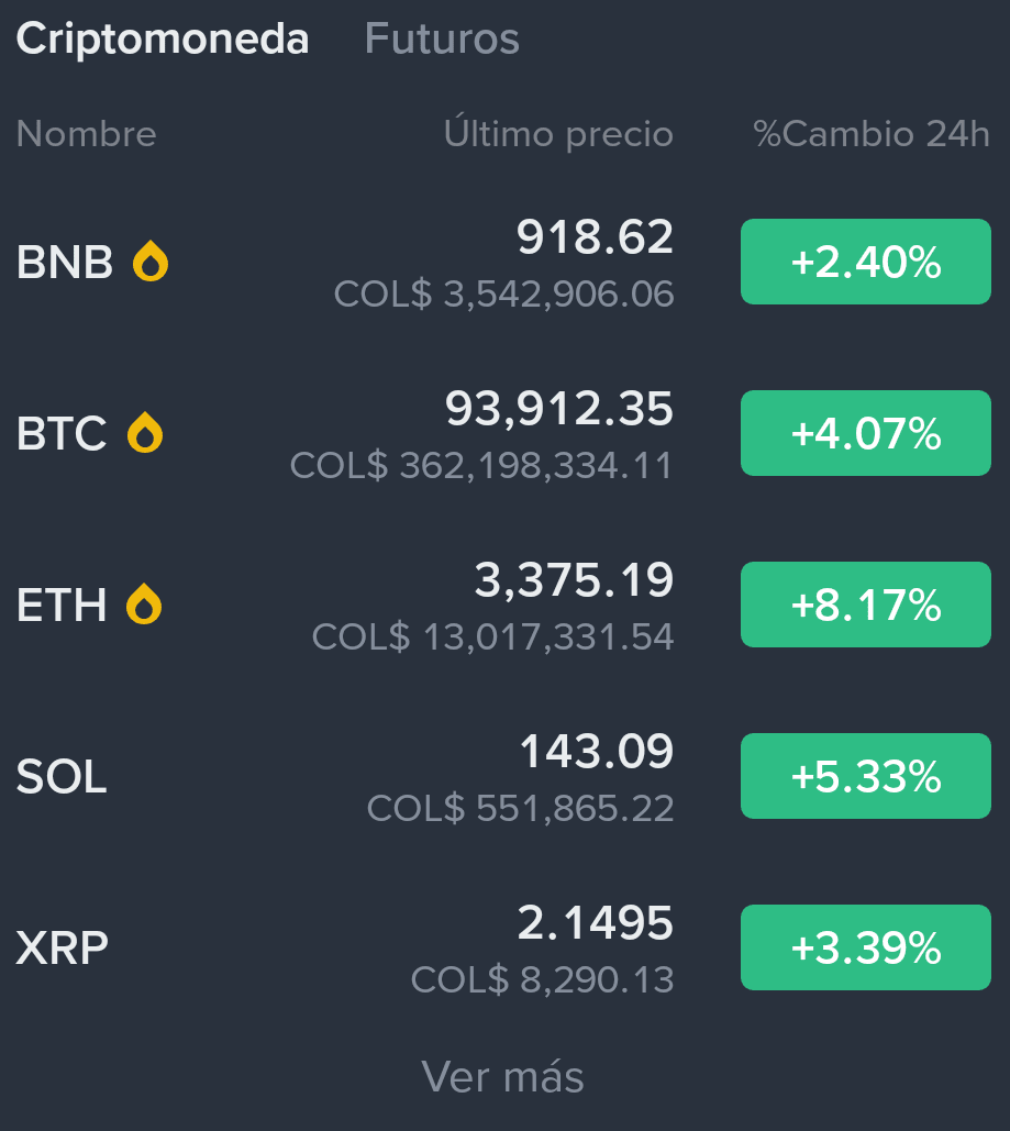 the cryptocurrency futures market shows a positive outlook with increases in the prices of major digital assets over the last twenty-four hours. BNB reaches a value of nine hundred eighteen point sixty-two with an equivalent in Colombian pesos of three million five hundred forty-two thousand nine hundred six point zero six, representing a rise of two point forty percent. Bitcoin leads with a price of ninety-three thousand nine hundred twelve point thirty-five and an equivalence of three hundred sixty-two million one hundred ninety-eight thousand three hundred thirty-four point eleven Colombian pesos, reflecting an increase of four point zero seven percent. Ethereum also shows a strong rise, trading at three thousand three hundred seventy-five point nineteen and thirteen million seventeen thousand three hundred thirty-one point fifty-four Colombian pesos, with an increase of eight point seventeen percent. Solana records one hundred forty-three point zero nine and five hundred fifty-one thousand eight hundred sixty-five point twenty-two Colombian pesos, with a positive variation of five point thirty-three percent. XRP closes the list at two point fourteen ninety-five and eight thousand two hundred ninety point thirteen Colombian pesos, rising by three point thirty-nine percent. This behavior suggests a widespread momentum in the crypto market, which could be related to macroeconomic factors, institutional decisions, or strategic moves by investors looking to take advantage of the volatility and growth potential of these digital assets.