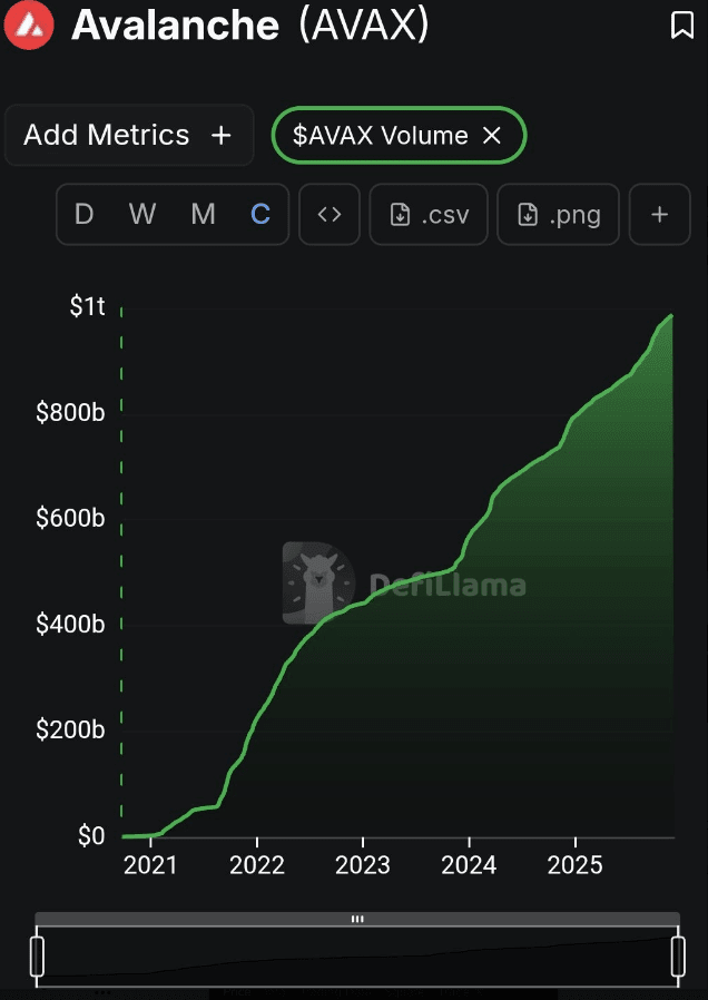 The cumulative trading volume of Avalanche (AVAX) has reached about 990 billion dollars, approaching the trillion-dollar level — a milestone indicating increased liquidity and expanded interest in the project.