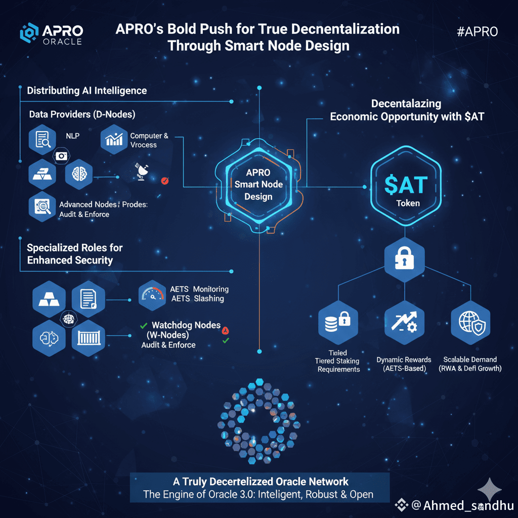 APRO’s Smart Node Design is a commitment to decentralization as a core principle, not just a buzzword. By distributing the computational intelligence and economic incentive among a versatile, high-performing network powered by the $AT token, APRO achieves: