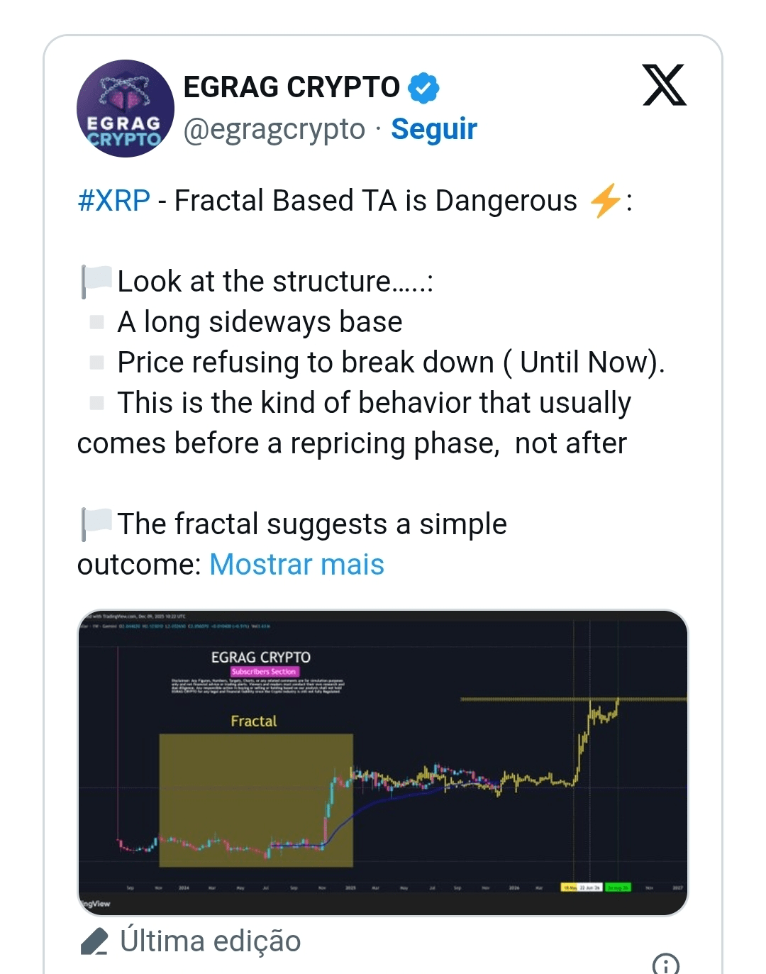 Egrag Crypto emphasizes that fractals reveal possibilities, not guaranteed outcomes. This context is important because XRP's bullish structure remains valid only while the main support holds.