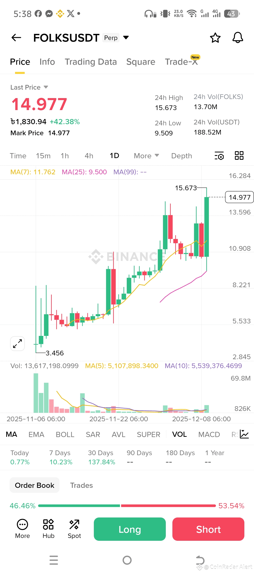 Hey DeFi degens and cross-chain cowboys—let's crack open this #FOLKS perp chart because Folks Finance is straight-up igniting the Algorand ecosystem like it's 2021 all over again, with a +42% 24-hour pump that's got the whole scene buzzing about this lending powerhouse's next moonshot. Sitting pretty at 14.977 right now, mark price locked in at the same with unreal volume exploding to 13.7 million FOLKS traded (that's $188M+ in USD action, folks), it's clawed back from that 9.509 low like a boss, blasting above the MA(7) at 11.762 and MA(25) at 9.500 on a cascade of green candles that scream institutional FOMO—especially with the order book tipping 46% to the longs amid fresh listings on Bybit Futures and xPortal integrations dropping 25% discounts for paying fees in $FOLKS. The 10.23% 7-day surge and 137% monthly roar? That's not hype; it's the protocol's TVL climbing past $127M across chains like Avalanche and Polygon, fueled by liquid staking upgrades and those Jump Crypto-backed innovations turning borrowing into a seamless multi-chain playground.