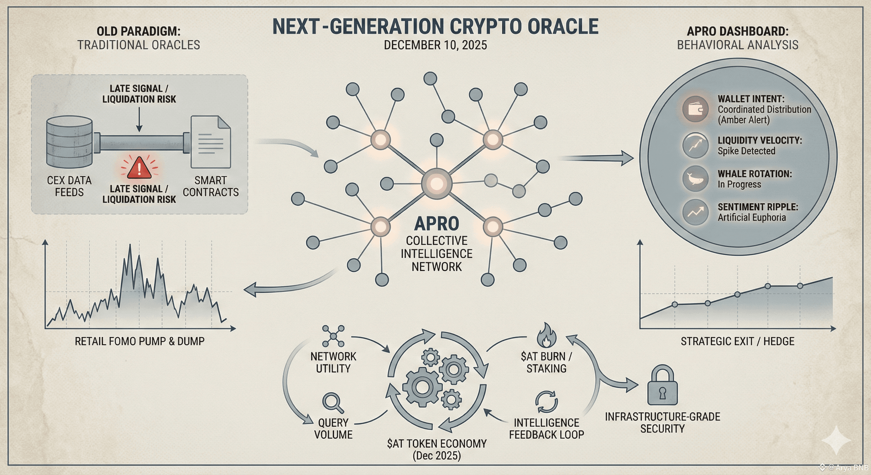 Because at 14:42 UTC that same afternoon (more than six hours earlier) the APRO dashboard had lit up with a calm amber cluster labelled coordinated distribution + fresh wallet rotation. No alarmist red banners no SELL NOW pop ups. Just a quiet note that the inflow velocity from new addresses had spiked 9.3× while long term holder outflows were perfectly disguised across twenty mid sized wallets.