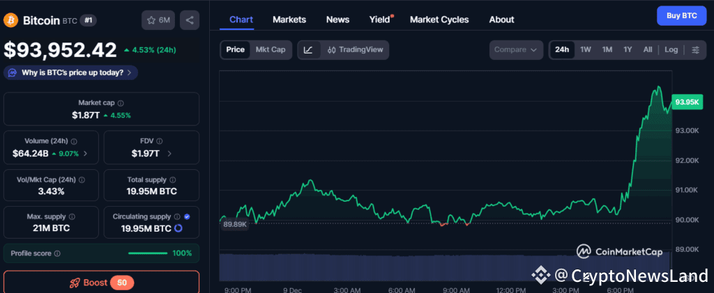 Cathie Wood's remarks about Bitcoin comes at a time when Bitcoin bulls are now showing signs of dominating the market. Tracking the ongoing price trend at the time of writing this article, CoinMarketCap confirms that in the last 24 hours, Bitcoin's price movement reported a notable increase from around $89,000 to $93,952.42. The price trend shows a steady ascent, culminating in a sharp peak at $93,952.42, noting a 4.53% uptick.