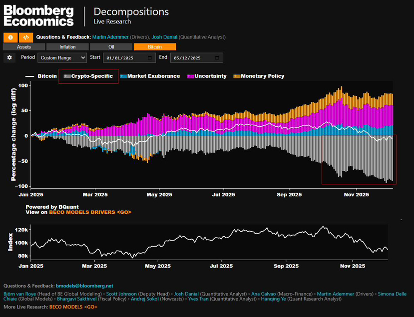 Their model of growth driver decomposition shows that the drop in Bitcoin in 2025 is almost entirely caused by internal crypto factors (see the gray area on the chart). Meanwhile, macro variables - monetary policy, market sentiment, uncertainty - on the contrary, were supportive (throughout 2025 they contributed to the price rather than pulling it down).