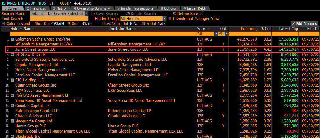 ▫️The first picture - Bloomberg data: Jane Street is among the top 3 holders of the iShares Ethereum Trust ETF, with a position of nearly $1 billion. Quarterly increase - +15 million shares. This is no longer a market maker; this is a systemic holder.