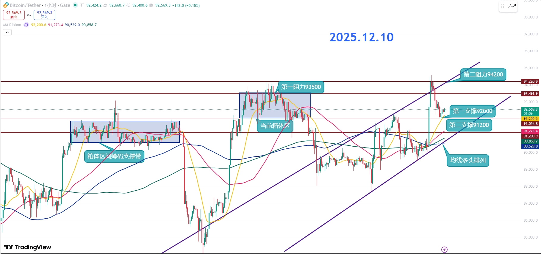92K is the best stop-loss and reversal point for the short term; you can start taking some positions in batches here. If it falls to the second support, you can continue to add, as the risk-reward ratio is quite suitable. The 91.2K level and the long-term moving averages below are also golden zones for building low-cost positions.