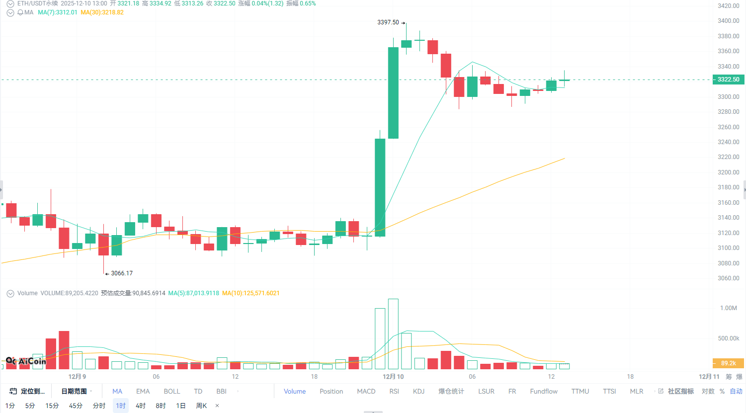 Looking at the moving averages, MA7 is at 3312, MA30 is at 3218, the short-term line is above the long-term line, the overall structure is not broken yet, but the problem is that the price is currently hovering near MA7, without forming strong support or momentum, it is in a suspended state, quite ambiguous.