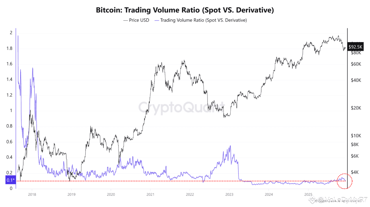 Це особливо важливо, оскільки обсяг деривативів значно перевищує обсяг спотових торгів. Згідно з метрикою Співвідношення Обсягу Торгівлі Біткоїном (Спот проти Деривативу), активність деривативів домінувала з піку циклу наприкінці 2017 року, підкреслюючи динаміку «крутить собаку», в якій ринки ф'ючерсів здійснюють надмірний вплив на коливання спотових цін. Наразі обсяг спотових торгів становить лише близько 10% від обсягу деривативів.