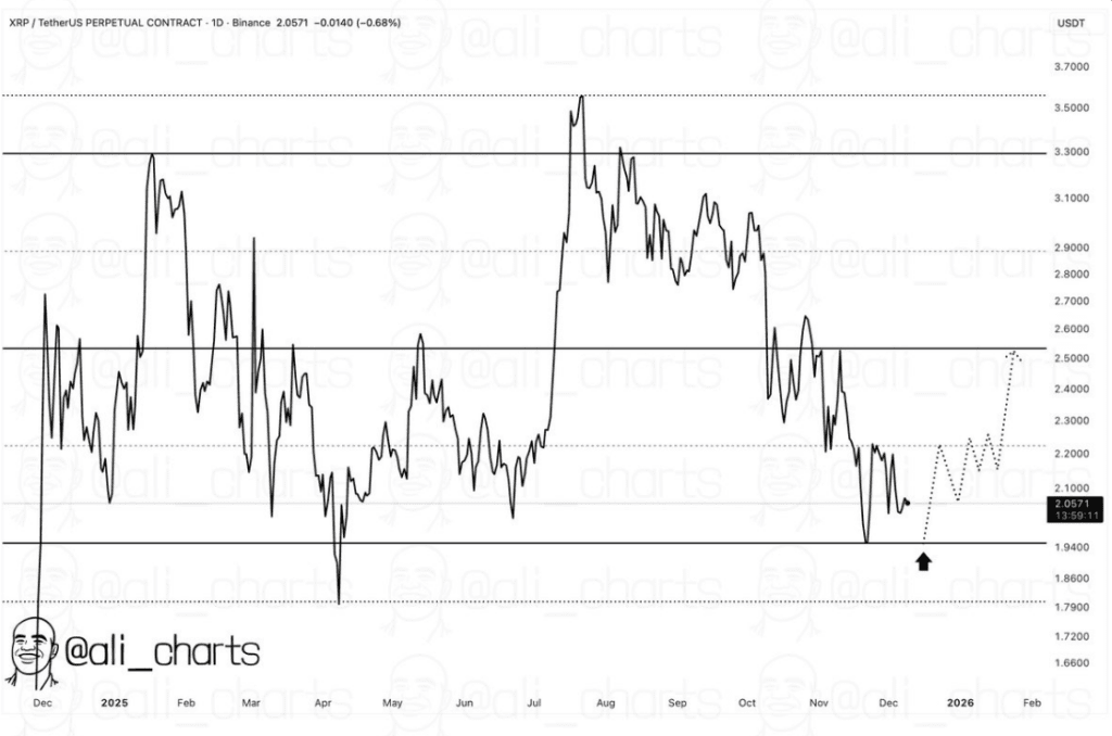 XRP has recently been stuck in a wide range — around $2.05 to $2.25 — after slipping from $2.60 earlier in November. It is now drifting back toward the lower end of this structure. Analyst Ali Martinez highlighted one level that stands out above all else: $1.94.
