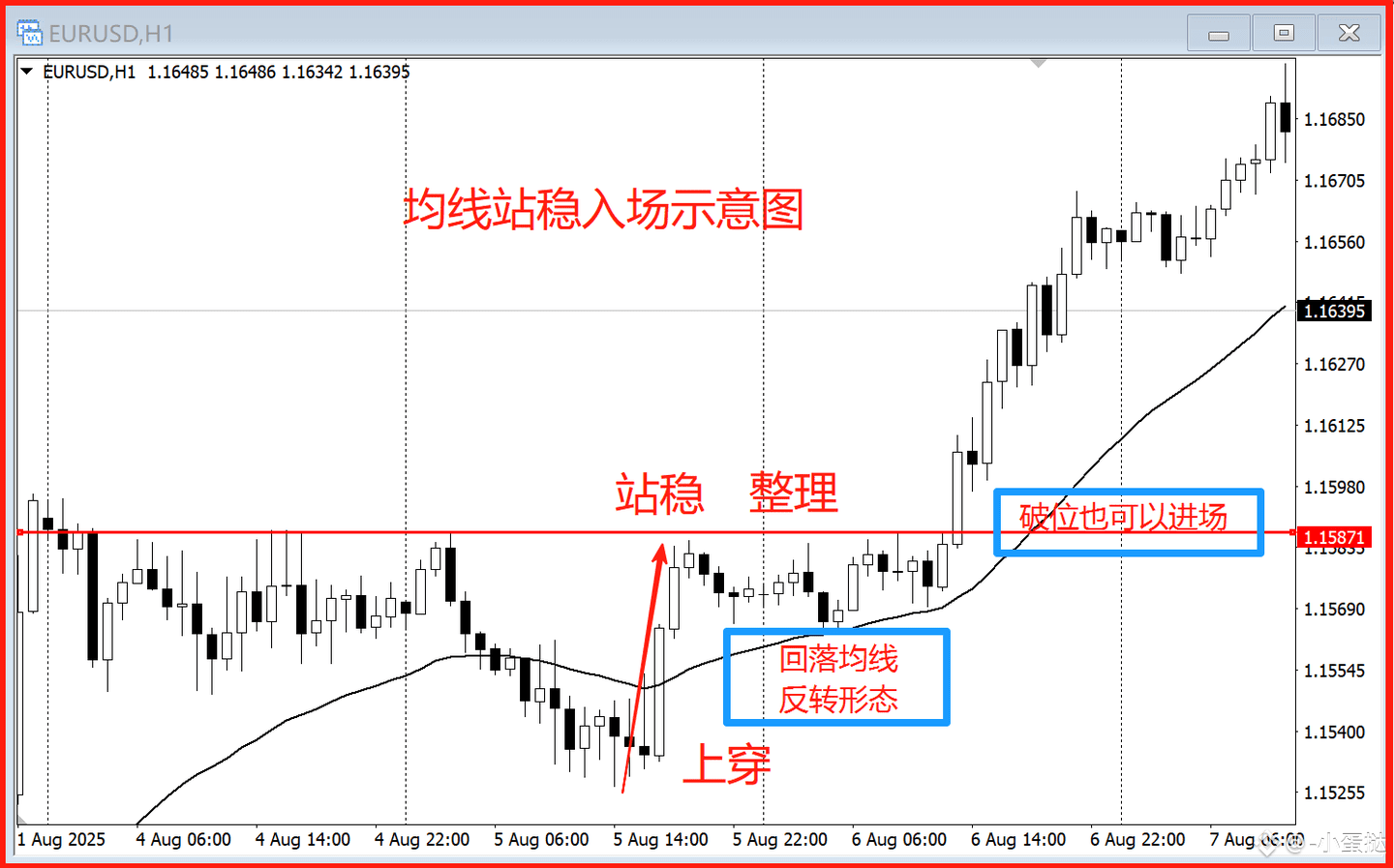 所谓“均线站稳入场”,其实就是一个比较口语化的说法,意思是:价格突破均线之后没有立刻掉头往回走,而是在均线上方(或下方)稳住了脚跟,这说明均线的支撑或压力起效了,此时再进场,成功率会更高。