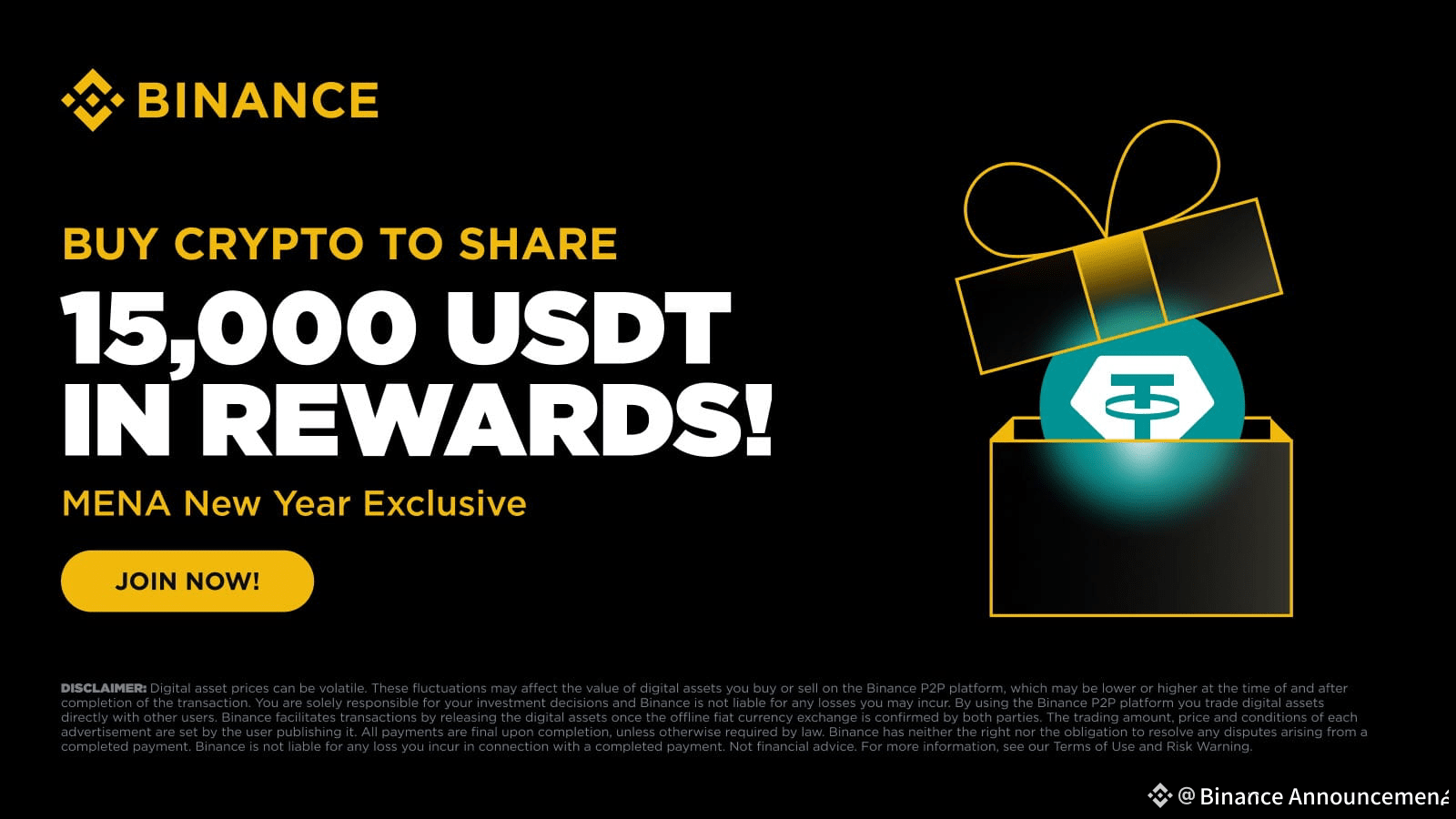 To celebrate the end of 2025 and the upcoming New Year, Binance is launching a new MENA promotion to welcome new users and show appreciation for our existing users. We are giving away 15,000 USDT in token voucher rewards to users from selected countries and regions. Join us in ringing in the new year with exciting rewards!