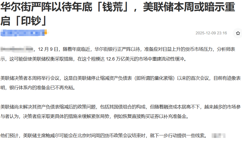 $BTC Crypto friends, I am the God of Wealth! The core macro variables that will determine the future market direction are about to be released: the Federal Reserve is likely to signal the restart of 'money printing' this week in response to the liquidity crunch at the end of the year. Follow the God of Wealth to prepare for this round of core asset trends driven by global liquidity.