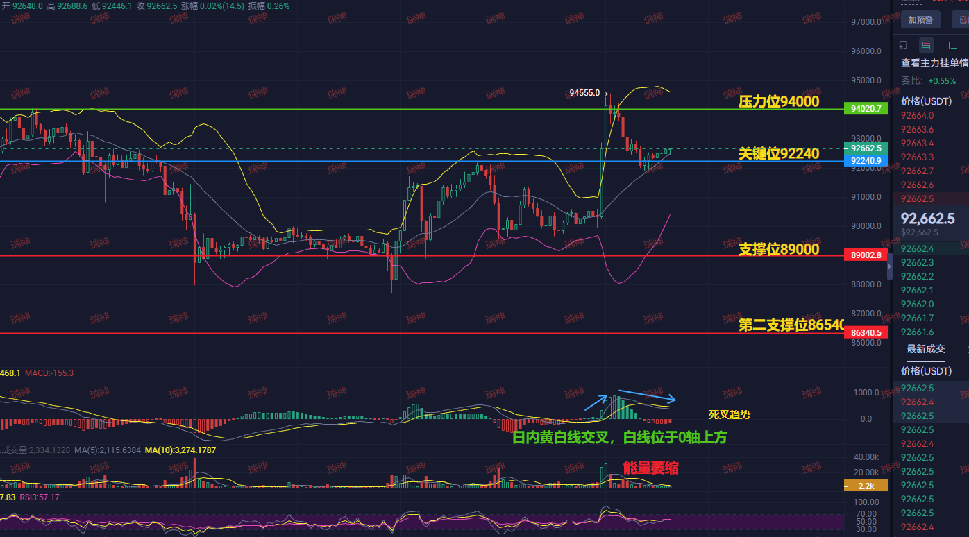 The market structure and macro favorable factors resonate. Both the 1-hour and 5-hour level systems give a 'strong buy' signal, and the price has strongly stabilized above the key level of 92240, creating a solid short-term support platform. Currently, although facing pressure at the 94000 integer level and with some energy depletion, this is precisely the typical accumulation posture before a breakout. Various short-term moving averages are already in a bullish arrangement, and the MACD indicator is above the 0 axis, technically possessing all the conditions to launch an upward attack.