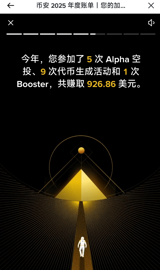 First, it shows that I have been using Binance for over 2100 days, trading popular currencies, including Dogecoin. In the alpha airdrop, TGE, and other projects, I made over 900 U, which surprised me because I didn't feel that way. Especially with the alpha airdrop, I ended up losing money; I estimate the official just calculated the value of the coins for the airdrop. For example, during the trading competition on the Soni chain, I lost a lot, with just two coins losing nearly 600 U. However, I am thankful for this statement generated by Binance, giving me a chance to look back at the situation in 2025. I also discovered my bird coin on the chain, which was very thoughtful.
