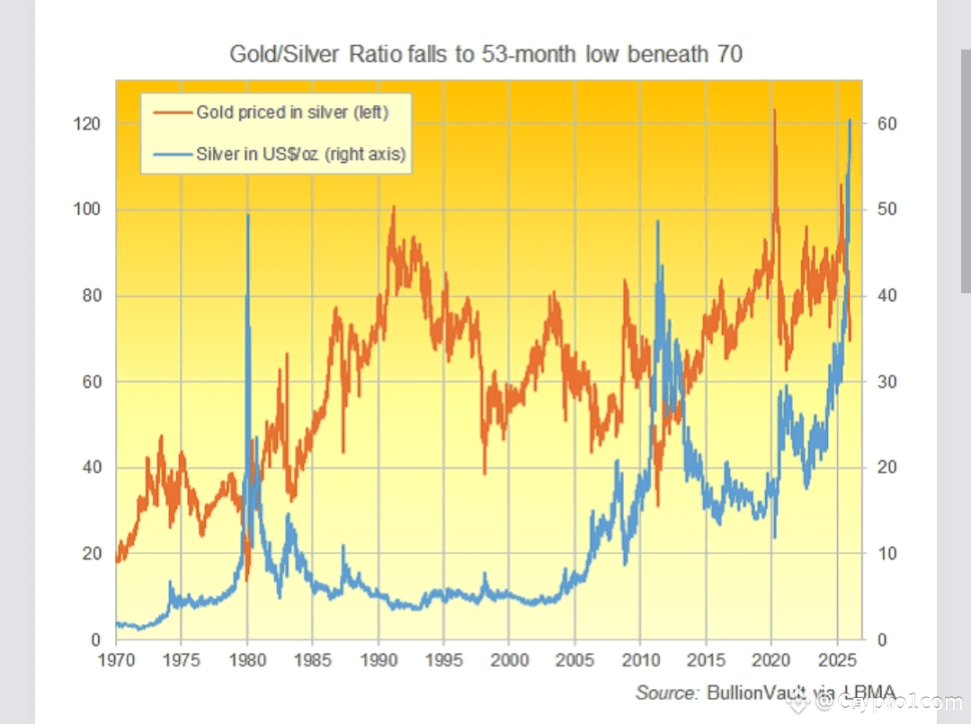 With gold trading at $4217 per Troy ounce this afternoon as silver spiked towards $60.47, the Gold/Silver Ratio dipped beneath 70 for the first time in 53 months.