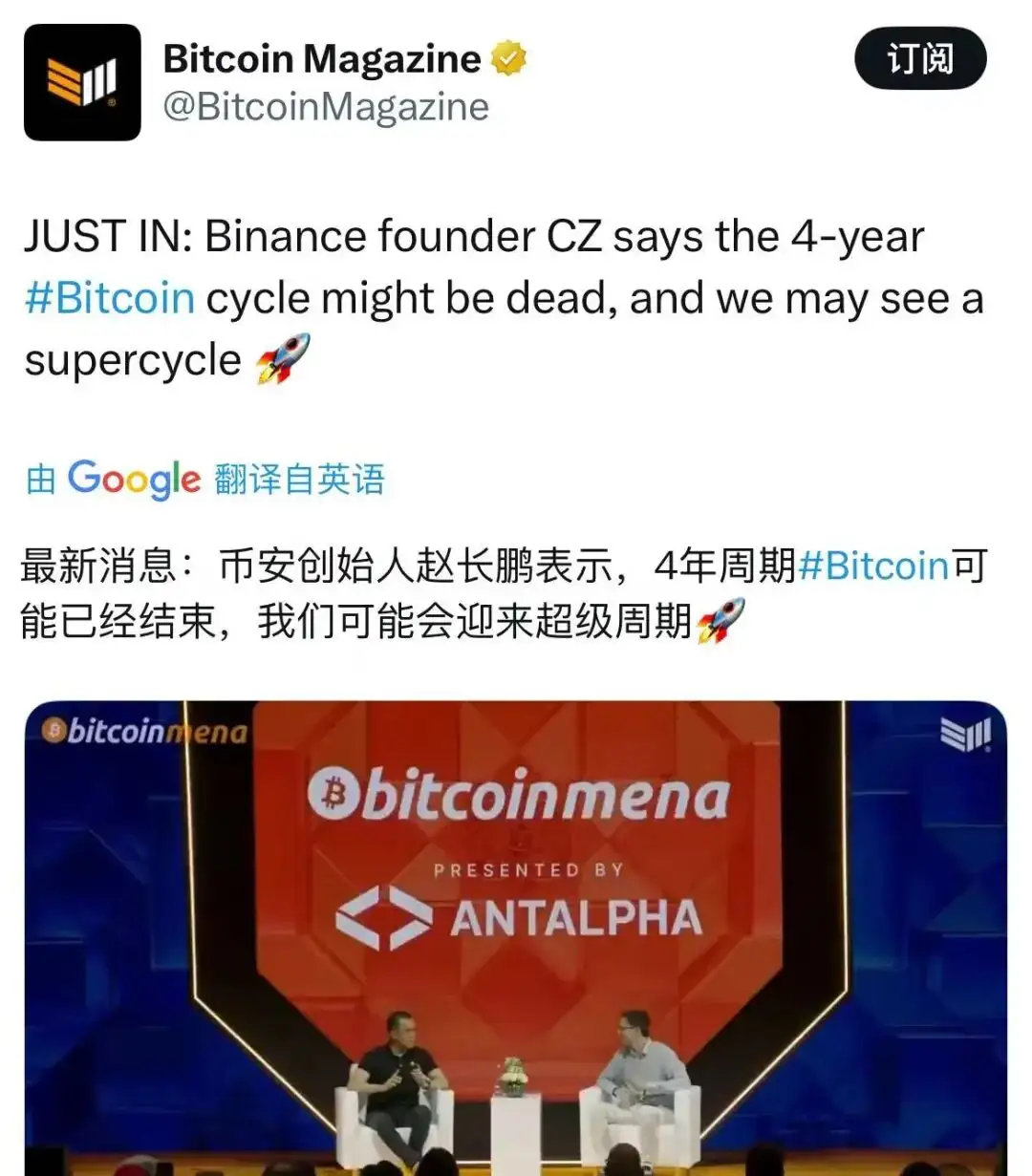 Latest news: Binance founder Zhao Changpeng stated at the bitcoinmena conference today that the four-year cycle theory may have ended, and we might be entering a super cycle!