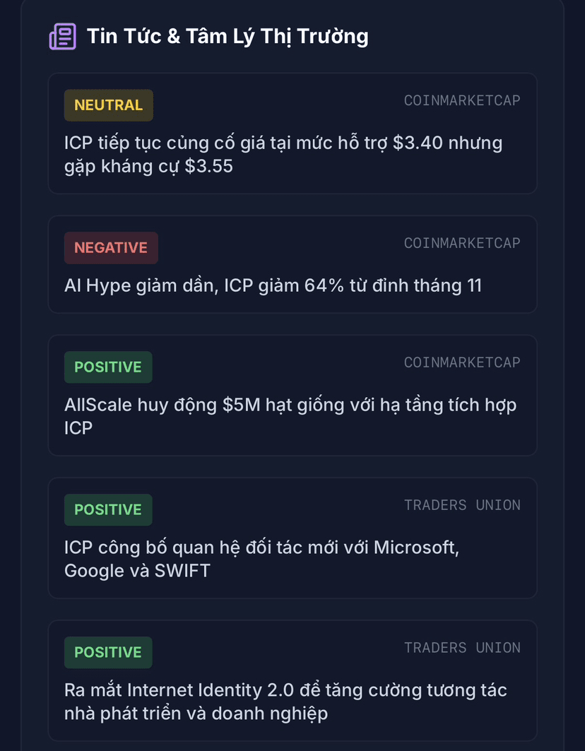 • Recent news has been extremely positive, including strategic partnerships with tech giants (Microsoft, Google, SWIFT) and significant technological upgrades (ICP 2.0, Internet Identity 2.0, Chain Fusion), indicating strong long-term growth potential.