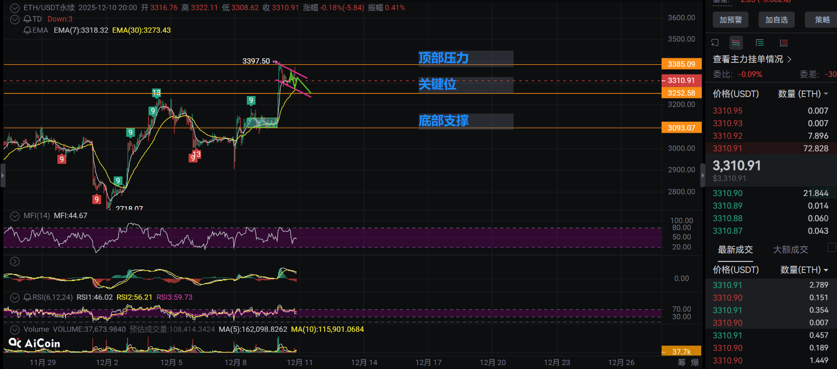 The Ethereum attack signal is at 3,400; once it stabilizes, the next target is 3,800, with short-term support at 3,250. As long as the trend holds, the bottom line is 3,100; falling back means the short-term offensive is over.