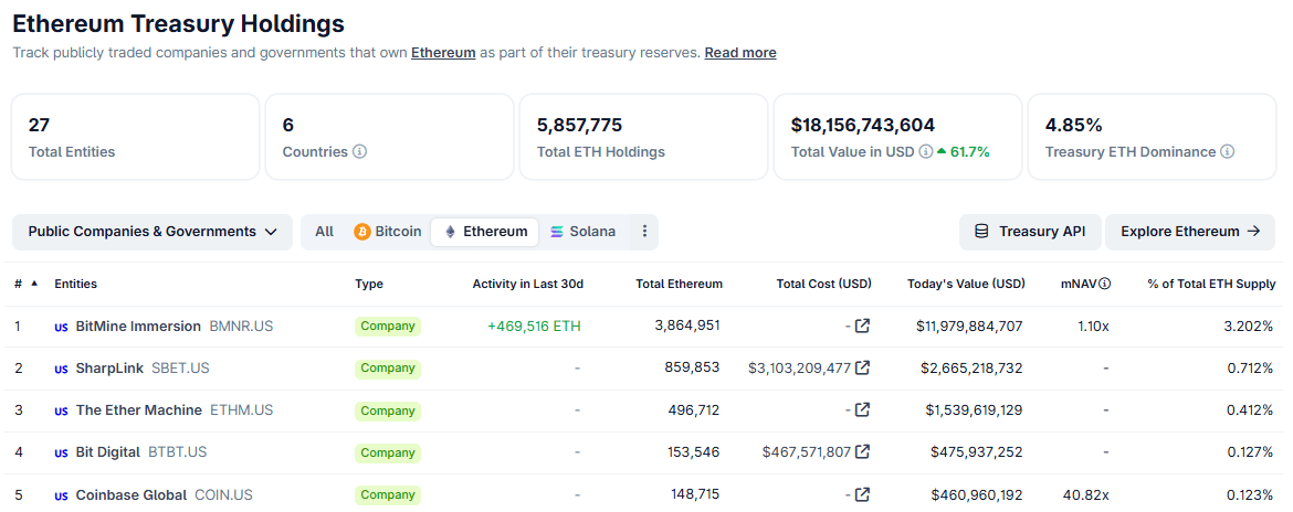 At current levels, BitMine controls more than 3.2% of the circulating supply of Ethereum, reinforcing its position as the largest Ethereum treasury owned by a company, and the second largest cryptocurrency treasury globally after Strategy Inc. (MSTR), according to CoinGecko data.
