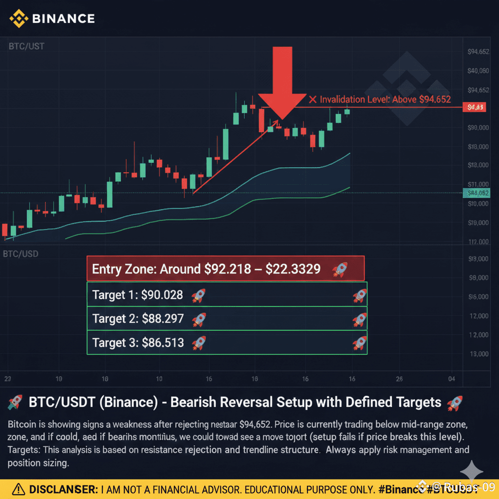 Bitcoin $BTC is exhibiting clear signs of weakness following a firm rejection at the overhead resistance level, which is currently near $94,652. The price is now trading beneath the intermediate mid-range zone. If the observed bearish momentum continues to build, we anticipate a decisive move down toward key lower support areas.