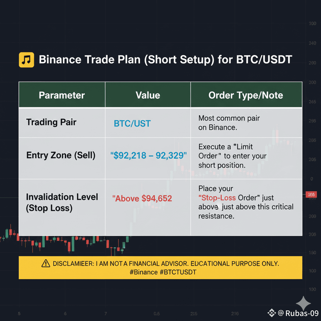 Entry Zone (Sell),"Around $92,218 โ $92,329",Execute a Limit Order to enter your short position.