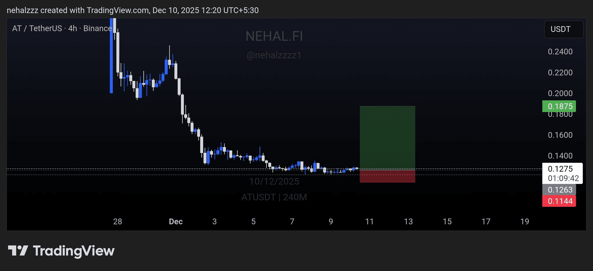 If you look at the chart you sent us, the picture is as clear as water: AT/USDT (APRO) is in a ditch. The current price of $0.1275 is the bottom of a merciless drop. The green zone that marks the hope of traders (that profit rectangle) is far above, at $0.1875, and to get there it has to break a heart-stopping bearish inertia.