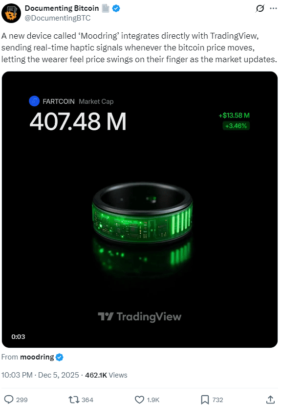 The new Moodring gadget allows traders to feel the changes in the cryptocurrency market literally at their fingertips. The ring integrates with TradingView and transmits short tactile and light signals at the moment of price movement of Bitcoin or another asset. The solution is aimed at users who need to monitor volatility without constantly checking charts.