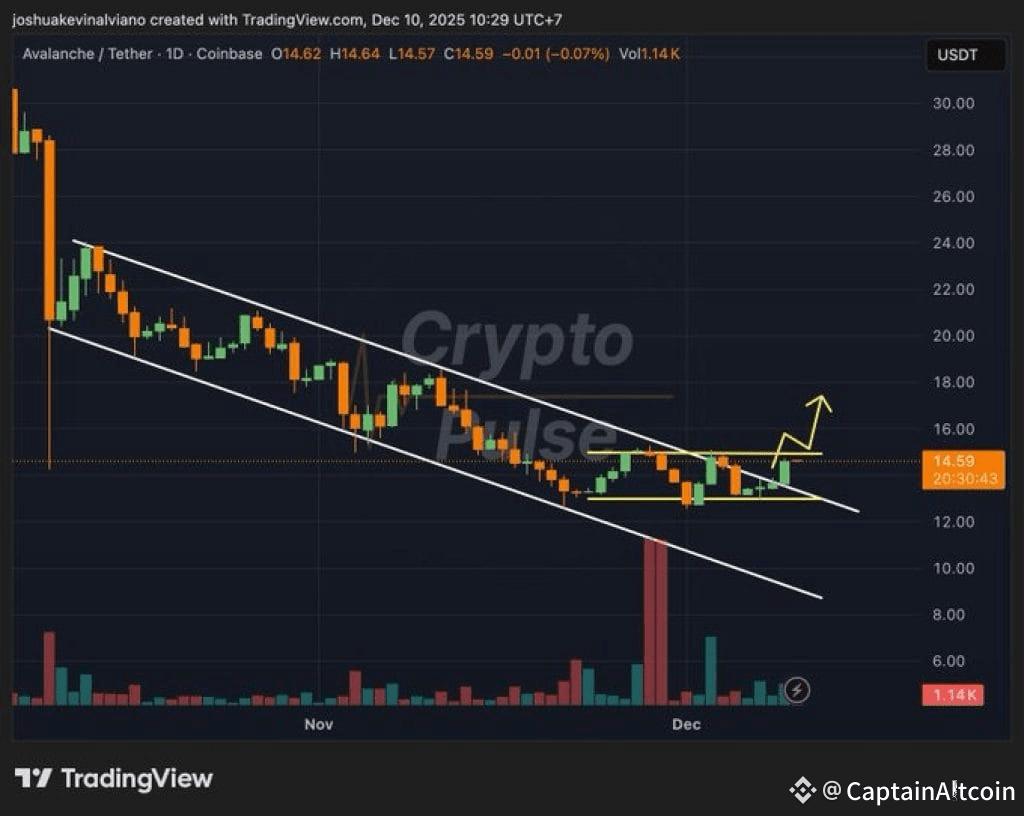 Right now, the Avalanche price is sitting just under that barrier. The chart shows stronger candles forming near the upper edge of the trendline, which usually hints that momentum is shifting. Once the $15 level breaks cleanly, traders expect the $20 area to become the next target.