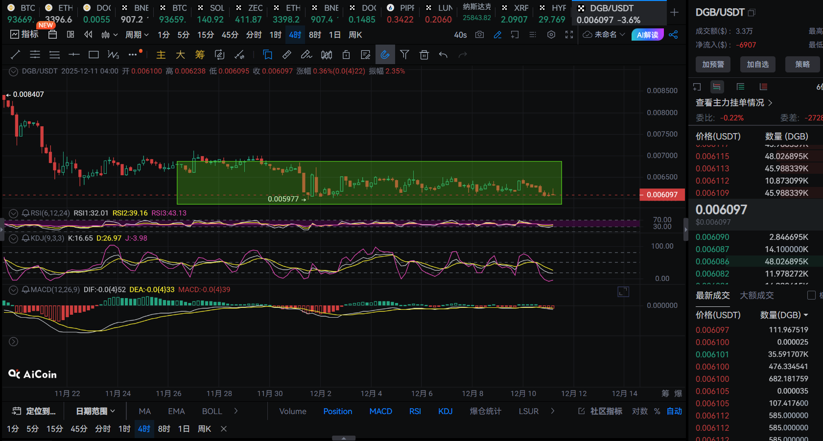 Veteran traders in the crypto space understand: "Small-cap coins without a story are tempting to buy when rising and disastrous when falling." Today, DGB/USDT on OKEX's 4-hour chart demonstrated this phrase as a "textbook case"— from an opening of 0.0061 it spiked to 0.006238, only to sluggishly drop back to 0.006097, with a trading volume of only 39,000 dollars, resembling a "zombie coin" forgotten by the crypto community. It appears "stable," but in reality, it's a "trap for investors."