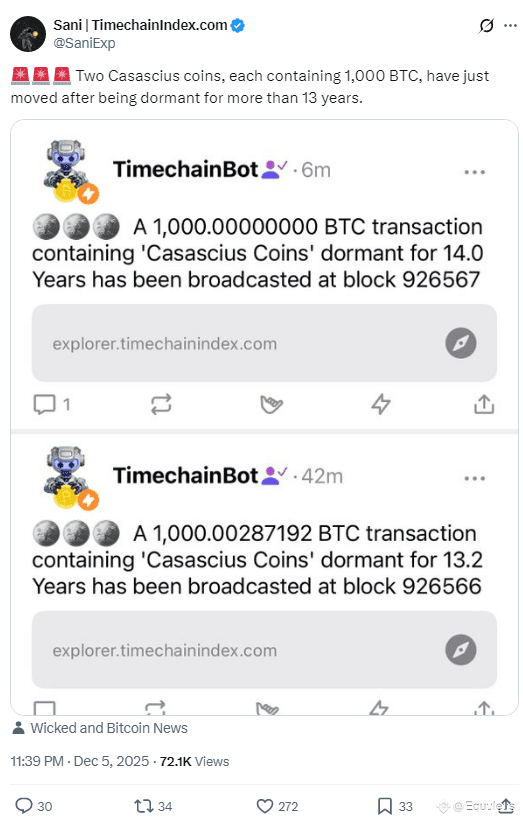 Дві рідкісні фізичні монети Casascius, у яких зберігалося по 1 000 BTC, вперше за більш ніж десятиріччя були переміщені їхнім власником. Рух цих монет, що залишалися недоторканими з 2012 року, зафіксували аналітики блокчейна: загалом активовано еквівалент близько $180 млн за поточним курсом біткоїна.