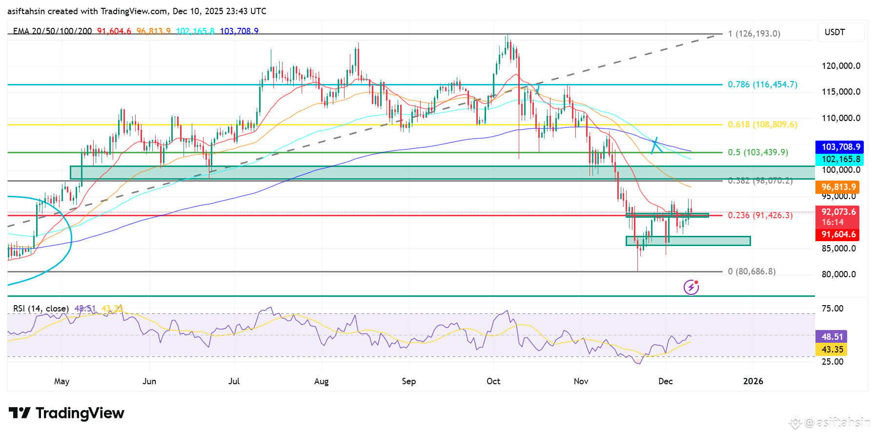 Bitcoin has shown a solid recovery after testing and holding the $86,000–$88,000 major support zone, an area that previously acted as a strong demand region across multiple months. This bounce allowed BTC to stabilize above the 0.236 Fibonacci level at $91,426, signaling early signs of renewed buyer interest.