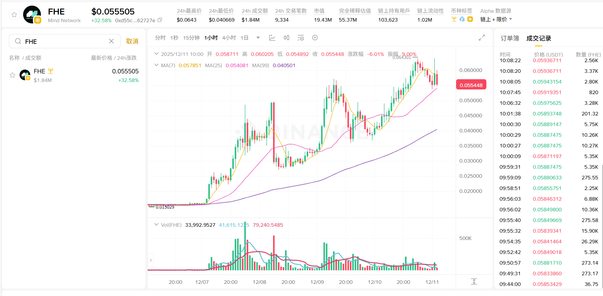 Recently, $FHE (Mind Network) has shown outstanding performance - currently priced at about 0.055 USDT, up approximately 247% since December 7, achieving nearly 3 times growth in just a few days. On December 9, it surged +55% in a single day, quickly climbing to the top of Binance's gainers list. The contract trading volume once ranked near the top, second only to SUI. All this data indicates that the market's enthusiasm and confidence in FHE are rapidly gathering.