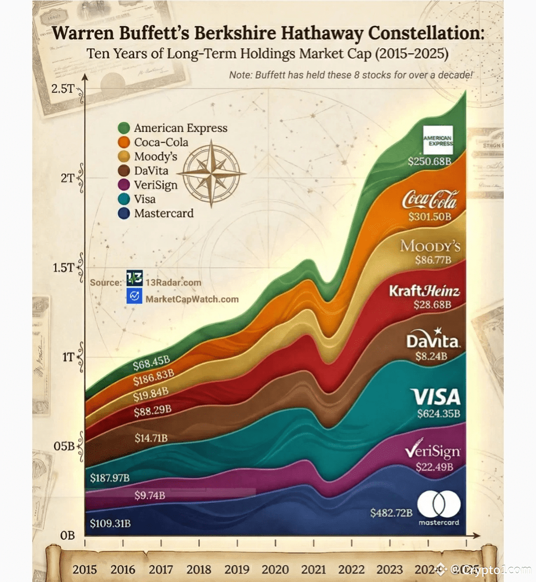 (Warren Buffett's current holdings). From Visa’s explosive rise ($188B → $624B) to Kraft Heinz’s decline ($88B → $29B), the chart reveals how long-term conviction plays out across sectors.