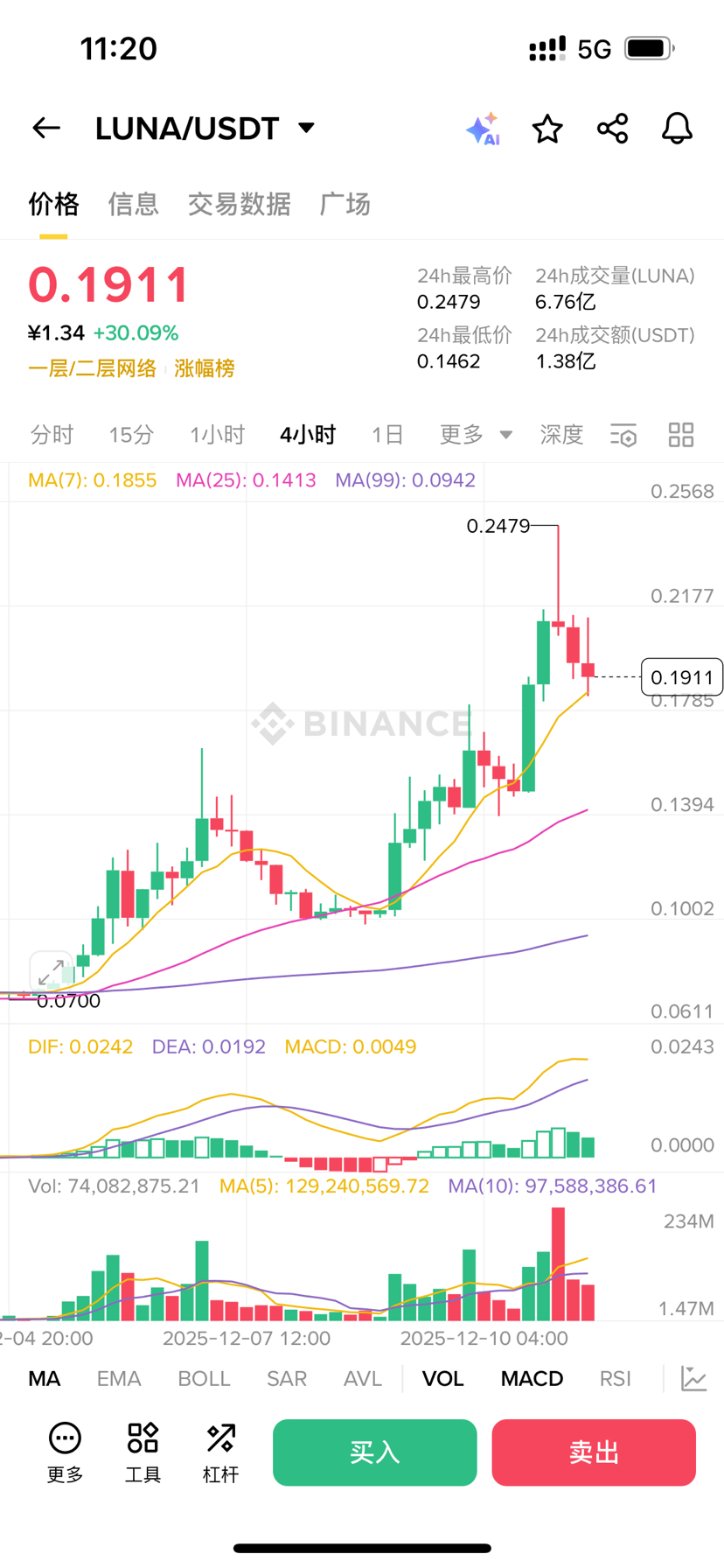 Recently, this LUNA coin has really gone crazy, pulling up every day without looking back. The screenshot is right there: it directly soared by 30% in 24 hours, and over seven days it’s even more exaggerated, nearly doubling. The current price is around $0.19, but look at that candlestick chart, it shot up to $0.24 and then crashed down, it's like a roller coaster, very thrilling.