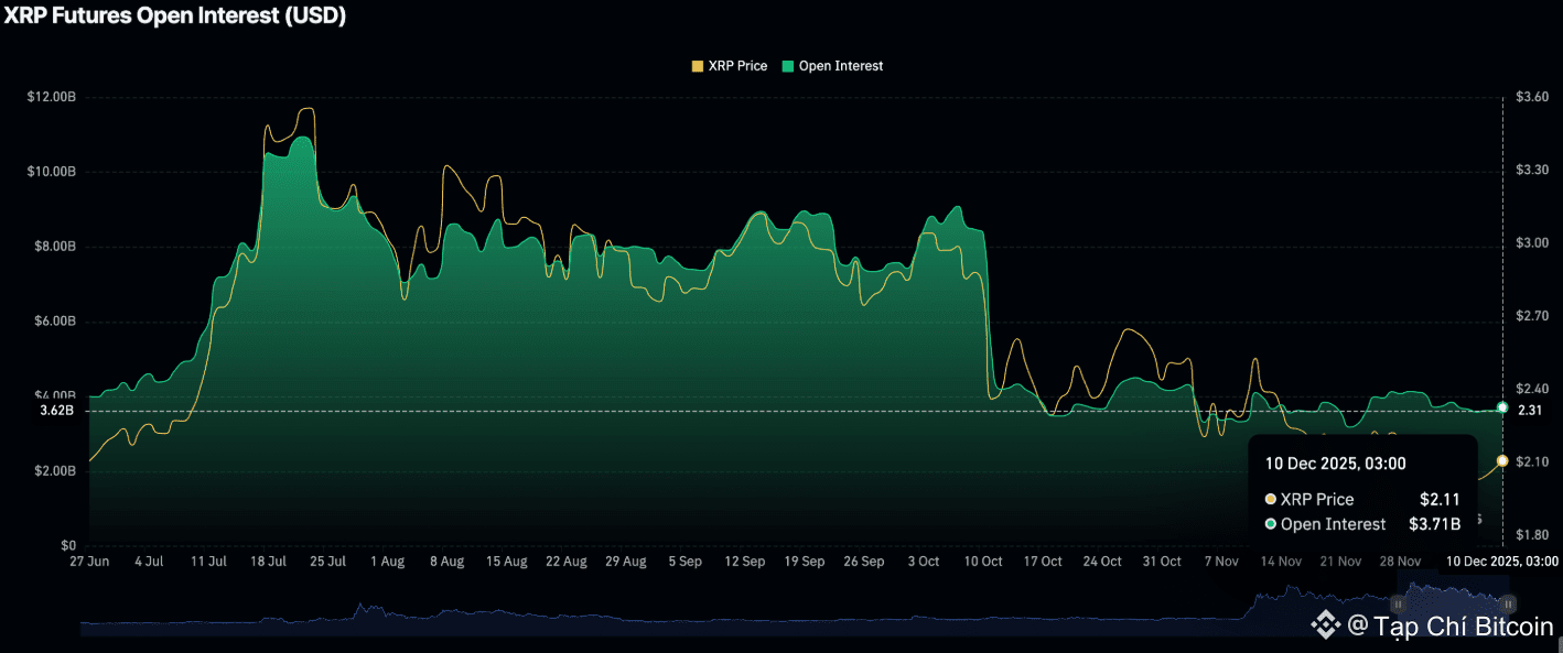Song song đó, nhu cầu đối với các sản phẩm phái sinh XRP vẫn duy trì sự ổn định. Hợp đồng mở (OI) hợp đồng tương lai vào thứ Năm đạt 3,71 tỷ USD. Dù vậy, con số này vẫn còn khá khiêm tốn so với đỉnh kỷ lục 10,94 tỷ USD hồi tháng Bảy, cho thấy lực mua từ nhà đầu tư nhỏ lẻ vẫn còn yếu, có thể là yếu tố kìm hãm đà phục hồi của XRP.