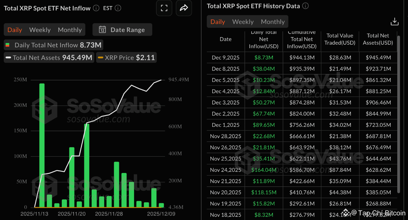 Các quỹ XRP ETF giao ngay vừa đánh dấu chuỗi 17 ngày liên tiếp hút vốn, riêng ngày thứ Ba ghi nhận thêm gần 9 triệu USD. Tổng dòng vốn tích lũy đã chạm mốc 944 triệu USD, kéo tài sản ròng (AUM) lên 945 triệu USD. Nếu vượt qua cột mốc 1 tỷ USD, ETF XRP có thể củng cố mạnh mẽ niềm tin về mức độ quan tâm ngày càng lớn từ các tổ chức.