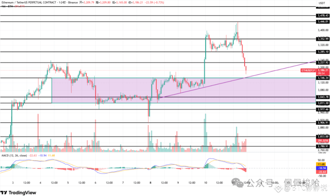 ETH在3146有趋势线和支持共振;按照当下行情ETH并没有回调到位有进一步以回调风险;右侧等待跌破3146回抽上方顺势做多吃个反弹,防守3067,目标3225和3285。