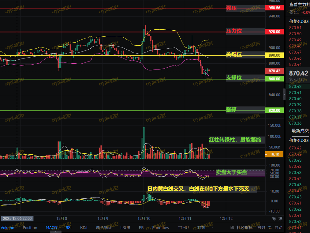 I believe that BNB will engage in a bloody game between 860-890 in the short term. 820 is strong support, but it does not mean it won't break; 890 is the key to rebound, but it does not mean that breaking through guarantees safety. The most dangerous action for retail investors at this moment is 'blindly bottom-fishing.' Remember, bear markets do not declare bottoms, especially when macroeconomic bearish factors have not dissipated. (If you don't know how to operate now, or if you're stuck, the best solution is to come to the chat room and find me for guidance.)
