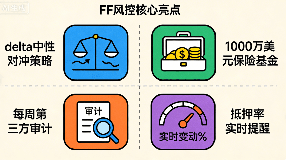 Hurry up and open the FF app to check the collateral status. I didn't expect the page to still show 'Safe.' Although the collateralization ratio dropped to 132%, it is still above the safety line. Later, I learned that FF has a delta-neutral hedging strategy that uses market tools to hedge part of the price fluctuations of crypto assets, effectively providing a layer of 'insurance' for my collateral assets. Moreover, the system automatically sent me a message alerting me of the current changes in the collateralization ratio, suggesting that if I am concerned about future fluctuations, I could supplement with a small amount of collateral. This level of thoughtfulness is much better than those previous 'cold' projects.