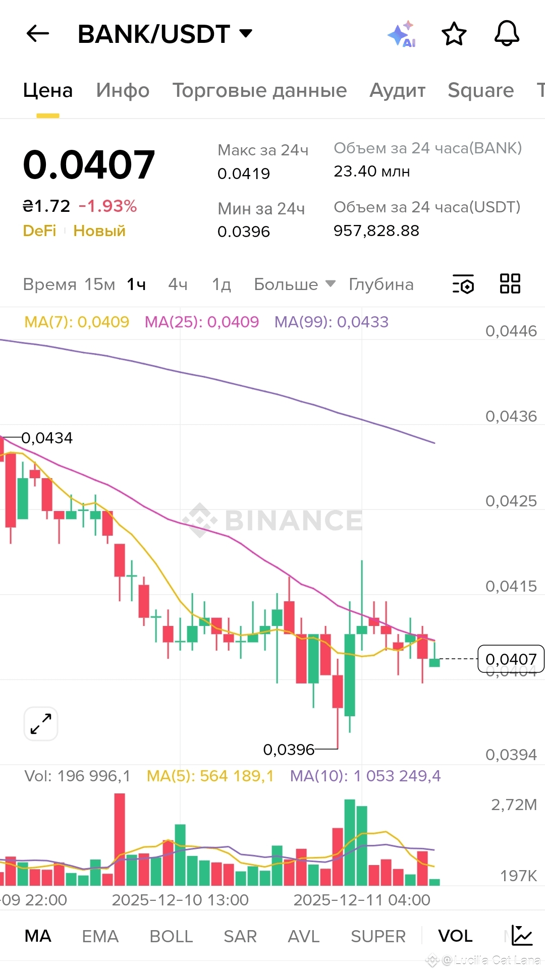 Поздний вечер, дождь за окном, смотрю на график $BANK - цена 0.0407, небольшой минус за сутки. И знаете, первое что бросается в глаза? Недельная и месячная скользящие средние СЛИЛИСЬ в одну точку на 0.0409. Буквально неразличимы на графике. Это такая редкость - когда краткосрочный и среднесрочный тренды полностью синхронизируются. И это всегда предвестник чего-то большого. Либо резкий рост, либо резкое падение. Рынок сжимается как пружина.