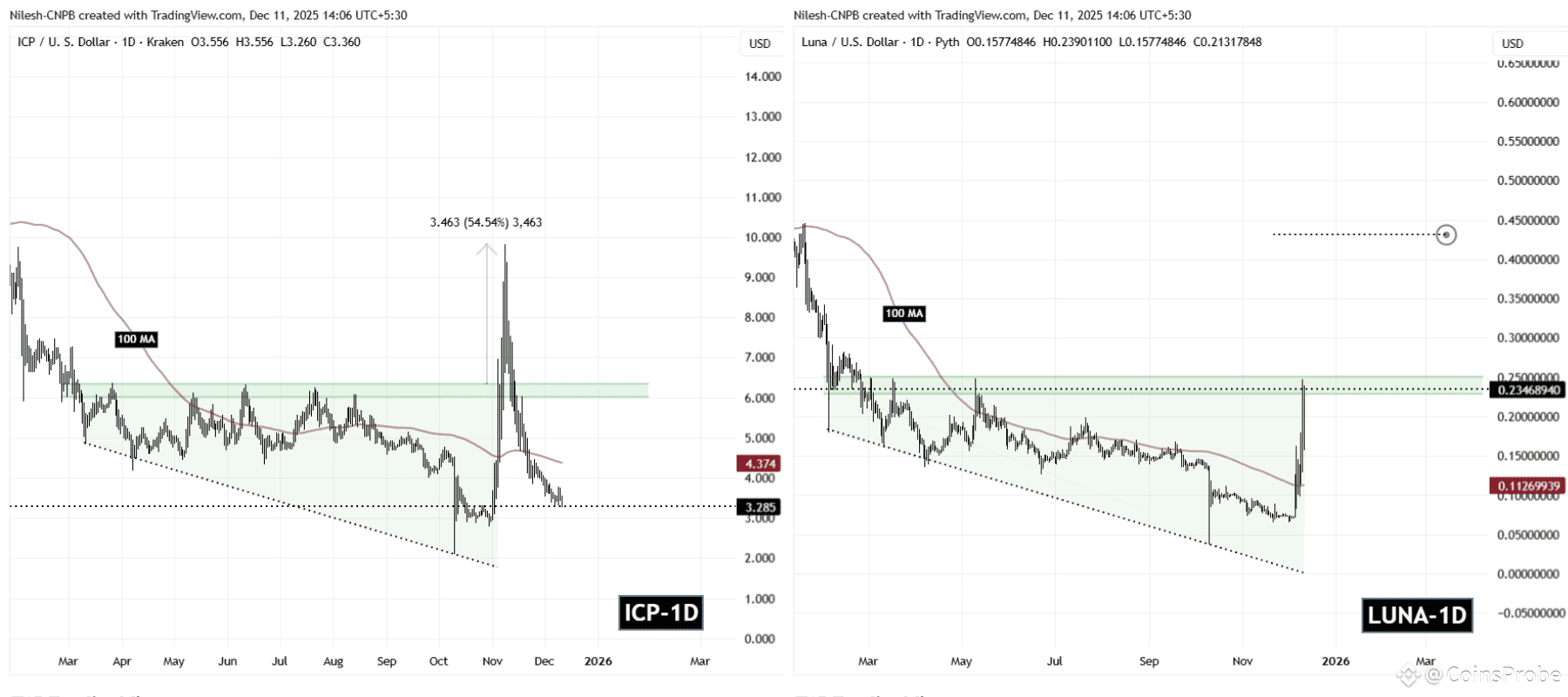 A side-by-side comparison of LUNA and ICP on the daily timeframe reveals an almost identical structural development, hinting that a stronger trend reversal may already be underway.
