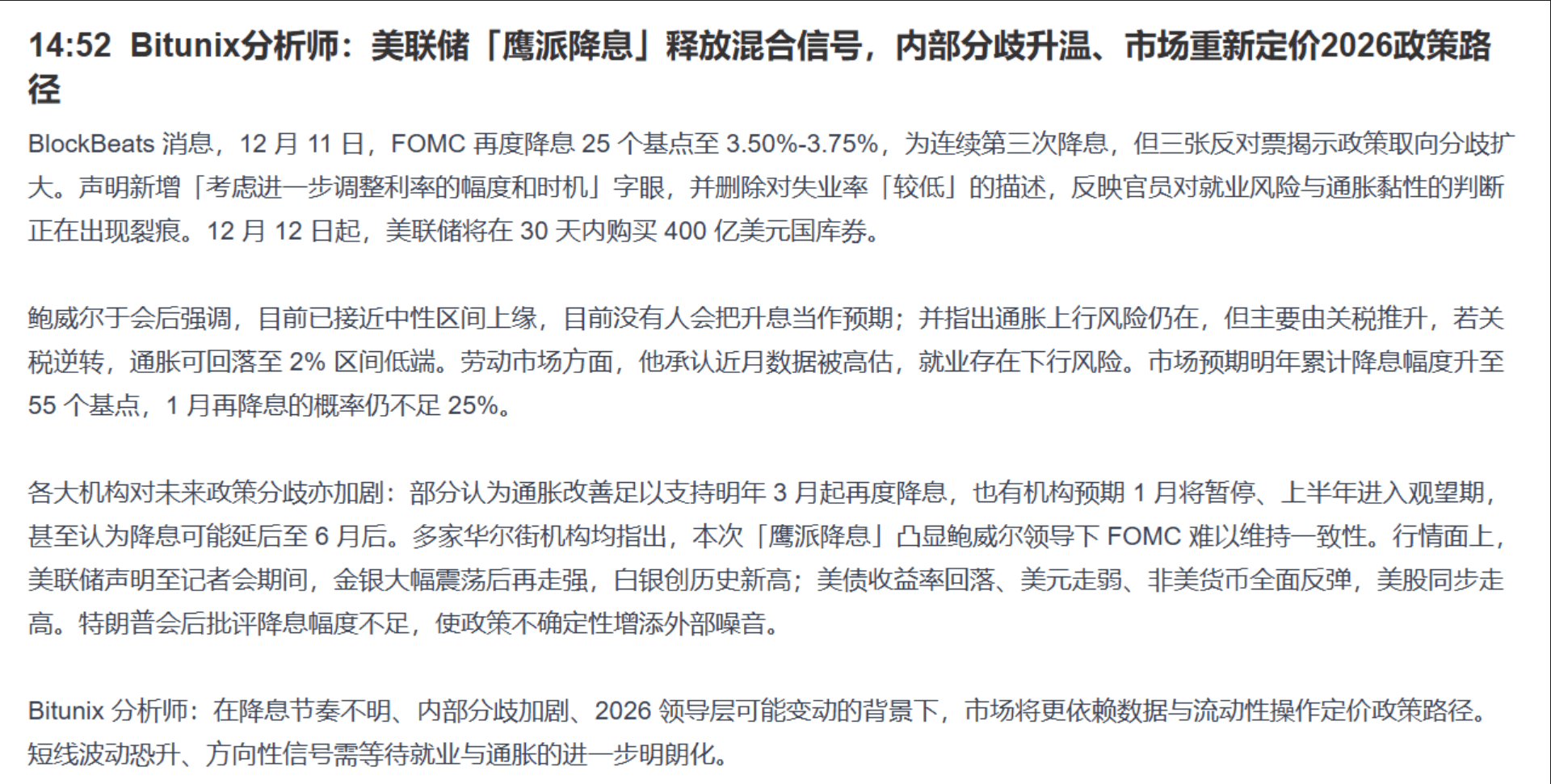 Although the Federal Reserve cut interest rates last night, internal divisions have intensified, and the statement's wording has become hawkish, the market interprets this as 'future policy uncertainty has greatly increased.' In this context, funds tend to avoid risks or watch from the sidelines, high-risk assets like SOL are more likely to be sold off first. It does not drop independently, but has become a 'bleeding point' for liquidity amidst macro concerns!