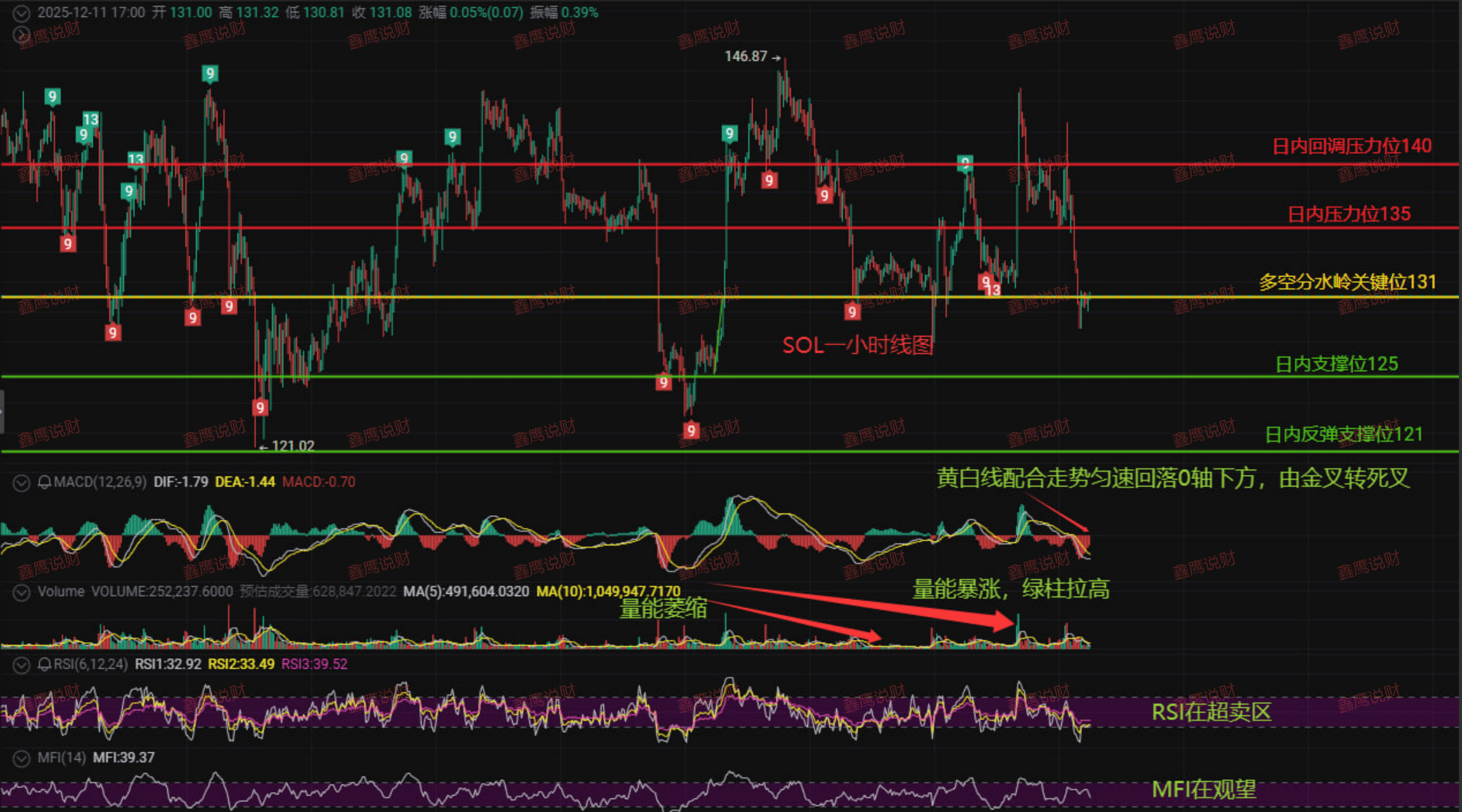 From the 1-hour chart, SOL closed at 131.08, having lost the 131 bullish-bearish dividing line, making the situation very passive. More dangerously: the MACD yellow and white lines have turned from a golden cross to a death cross below the zero axis, and the volume has suddenly surged, which is a typical signal of 'increased volume drop'! The RSI has entered the oversold zone, indicating extremely high short-term selling pressure. The upper resistance zone of 135-140 has become a heavy pressure zone, and if the 125 support breaks again, the next target may be 121!