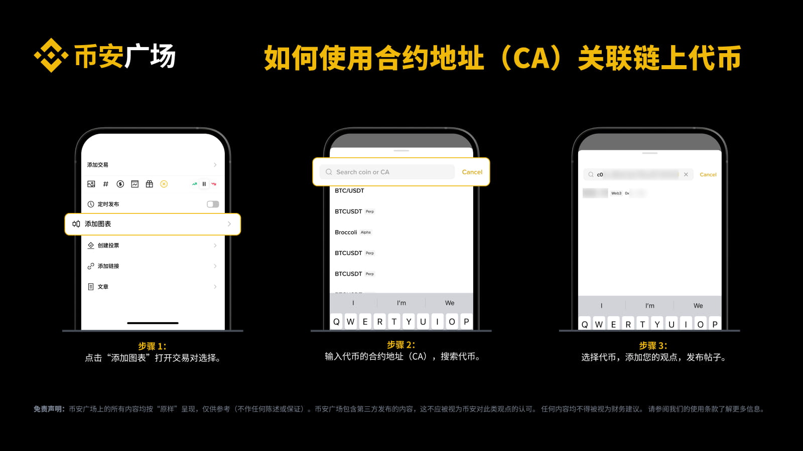 Now, you can directly associate various on-chain tokens in posts and live broadcasts on Binance Square—even if these tokens have not yet been listed on Binance Spot, Futures, or Alpha platforms. Simply search for the contract address (CA) of the token to add it to your content, and click to easily jump to the token detail page. This helps you effortlessly connect with the relevant token community without frequently switching between content and Web3 wallet pages.