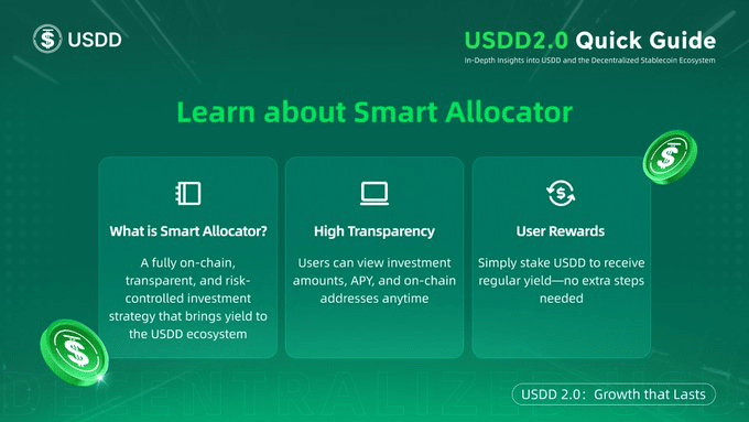 Smart Allocator: USDD’s yield distributor, deploying reserves to protocols like Aave/Venus to earn interest and share it with users. The first round of investments has been completed, and the address is public (0xD00e0079B8CAB524F3fa20EA879a7736E512a5Fc).