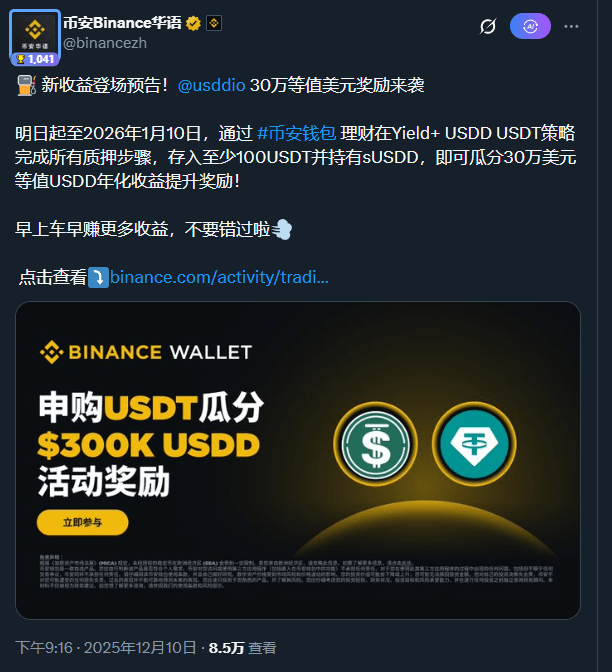Event details: Launching on December 11, subscribe to the USDT to USDD strategy, sharing a 300,000 USDD reward (10,000 USDD pool daily, no TVL cap). Path: USDT → USDD → sUSDD, minimum 100 USDT.